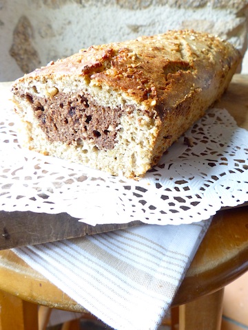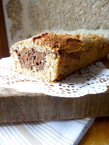 Le magazine Elle à table de septembre-octobre 2015 consacre justement une rubrique aux “bread cakes”, des gâteaux peu sucrés et gras, alliés du petit déjeuner. J’ai adapté illico presto leurs recettes en une version personnelle sans gluten… Détail gourmand : la marbrure de cacao!