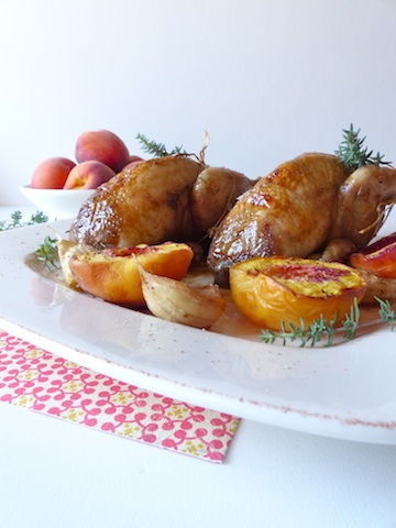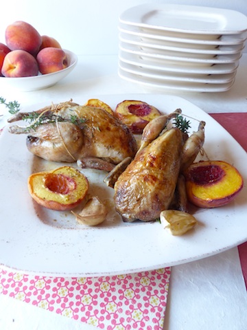 Les fruits de saison m’ont inspiré cette préparation de cailles rôties au four. Les saveurs des pêches et de la volaille se marient très bien. Pensez tout de même à une entré car ce n’est pas très copieux!