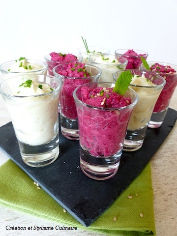 Des verrines printanières betterave-menthe et asperge-ciboulette pour un apéritif sain! Une petite crème végétale pou lier le tout.