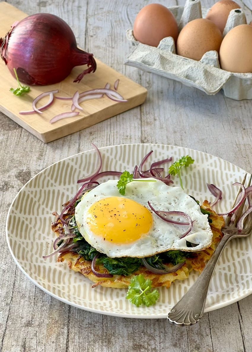 - Pancake de pomme de terre râpée, épinards et oeuf au plat