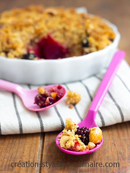 Il sent bon la fin de l’été ce crumble de fruits rouges et pommes aux noisettes ! En effet, la saison des pommes commence et celle des fruits n’est pas tout à ait terminée. Rien de tel alors qu’un crumble pour sublimer ces fruits et finir un repas gourmand sur un dessert pas trop lourd… Pas d’oeuf dans cette recette et peu de farine si bien que les non intolérants risquent de ne pas s’apercevoir qu’il s’agit d’un plat sans gluten !
