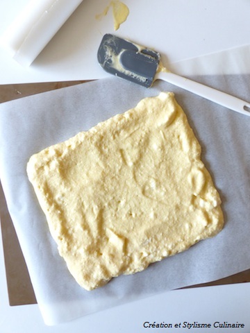 Ensuite, concernant la génoise, séparer les blancs des jaunes d’oeufs. Fouetter ces derniers avec le sucre puis la farine. Monter les blancs en neige et les incorporer à la préparation précédente.