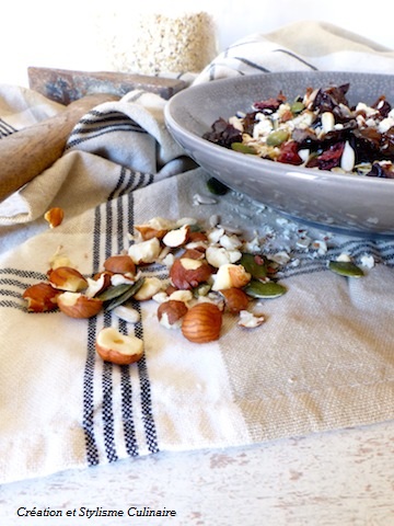 Bonjour, je fais aussi moi-même du granola maison mais je ne mets jamais les fruits secs avant la cuisson de peur de les voir sécher encore plus. Je les incorpore au muesli au sortir du four.