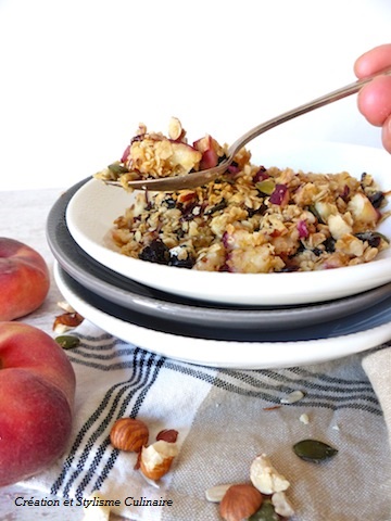 Dans cette recette, j’ai associé deux types de flocons différents mais aussi des fruits oléagineux (noisette…), frais (pêche) et secs (cranberries, pruneaux). Légèrement grillé au four, ce granola est un délice! A consommer avec ou sans lait végétal…