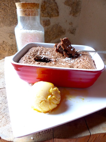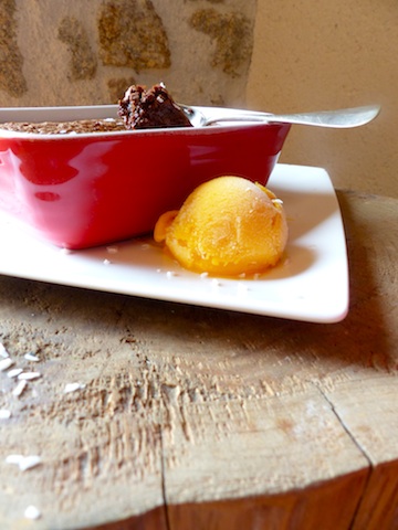 Juste une portion pour deux, à déguster en amoureux avec une boule de sorbet mangue. Bien moelleux voire fondant à cœur, un délice…