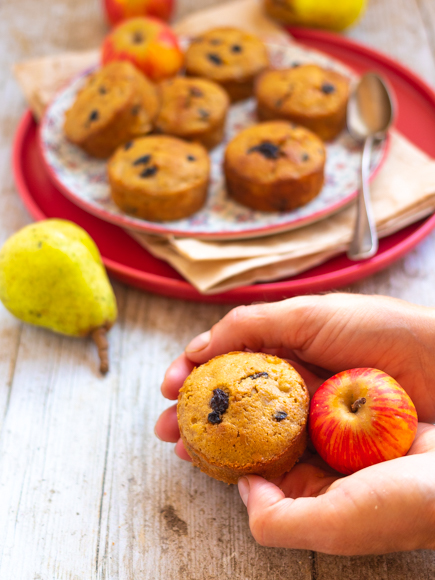 Ces muffins sans gluten aux pommes, poires et raisins secs tombent à pic ! Ils constitue un délicieux goûter au retour de l’école ou un dessert de format raisonnable (gourmande, moi ? pas du tout…).