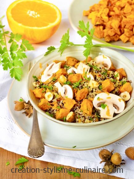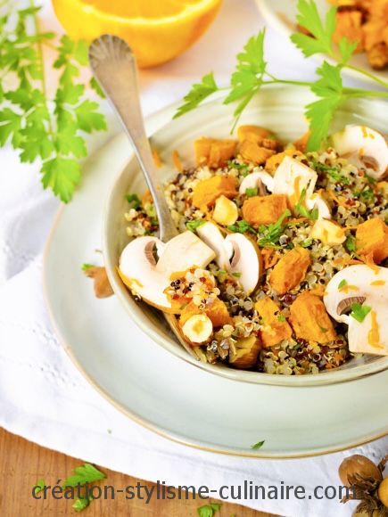 Lorsque le quinoa est cuit, le disposer dans 4 assiettes creuses. Ajouter la courge rôtie, les champignons, les noisettes concassées, le persil ciselé et éventuellement les zestes d’orange pour terminer.