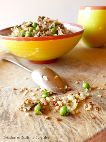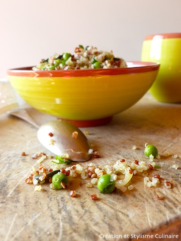 5 minutes avant la fin de la cuisson du quinoa, rajouter les petits pois afin de les garder croquants.
