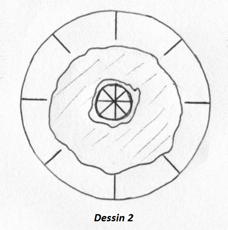 Avec un verre, dessiner un petit cercle au centre (dessin 1). A la pointe d’un couteau, découper la pâte à tarte comme montré (dessin 1 également). Garnir généreusement la pâte suivant un cercle intermédiaire (dessin 2).