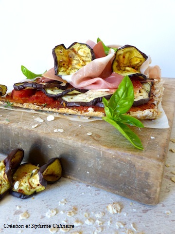 A la sortie du four, garnir généreusement la pâte de tomates concassées auxquelles vous aurez ajouté la gousse d’ail écrasée et le basilic ciselé. Ajouter les rondelles d’aubergines et le jambon de pays en chiffonnade.