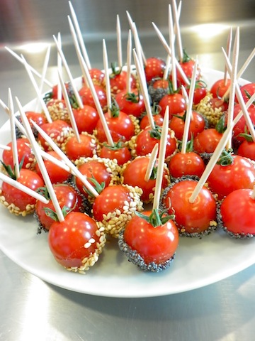 Gourmand, croquant, collant, voilà les tomates cerises revisitées pour un apéritif sans gluten plein de surprises…