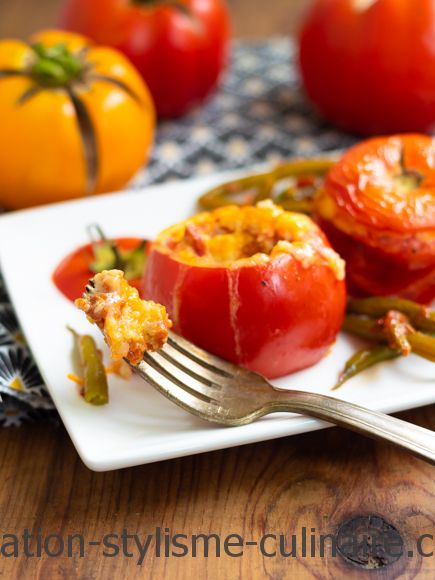 Servir les tomates farcies aux oeufs bien chaudes avec des haricots verts, du riz ou une salade verte !